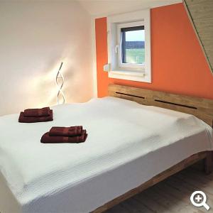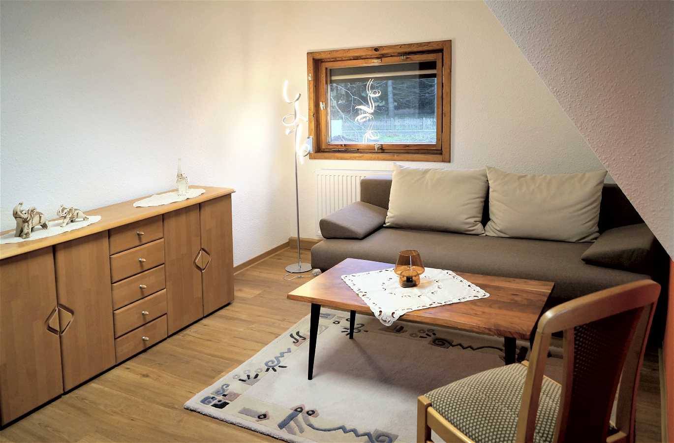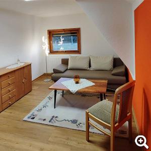 Diese Ferienwohnung mit einer Größe von ca. 68m² liegt im Obergeschoss und ist für 2 bis 5 Personen geeignet.Sie besteht aus Wohnzimmer, Küche mit Essecke, sowie zwei Schlafzimmern. Das zweite Schlafzimmer befindet sich im Dachgeschoss. Die Aufbettung für die fünfte Person erfolgt auf dem Schlafsofa im Wohnzimmer.